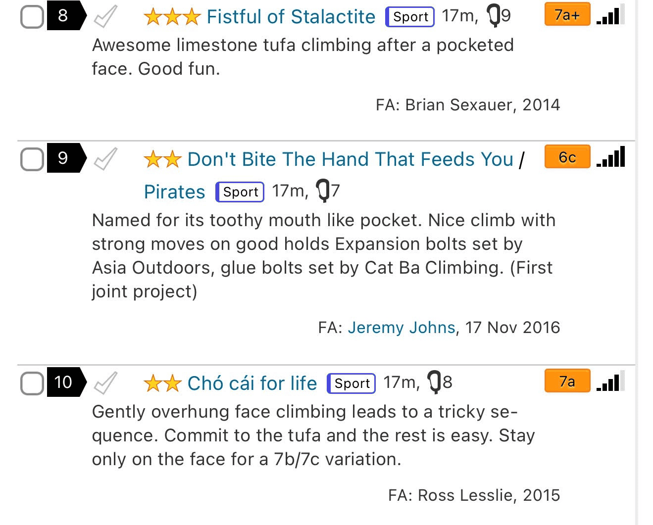 • Cat Ba Island's newest crag is an imposing cave overlooking Cat Ba Town. It can be reached in a few minutes, is completely sheltered from the rain, and has a small but varied selection of climbs. A great option for a hot or rainy day!