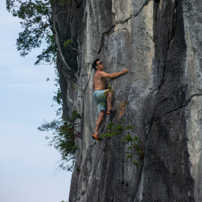 Then the boat will go to the first wall called Sea Face, while the guide will explain and give you some tips on jumping and landing techniques. Before each climb, they will explain the name, level and some difficult moves that you may need when climbing. First, you will start with a basic level (4a, 5m high) to get used to the feeling of jumping and adjust the landing technique, then based on your strength and climbing skills, our guide will suggest the next routes for you to try. There are about 15 routes on Sea Face, classified from 4a to 7a, mostly from 5a to 6b. There are also some overpass routes if you do not want to jump from too high a height.